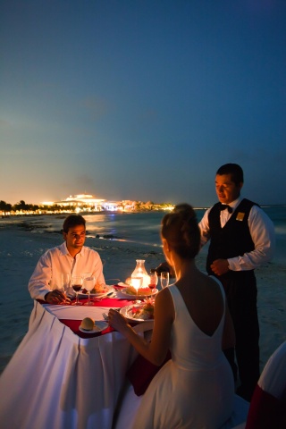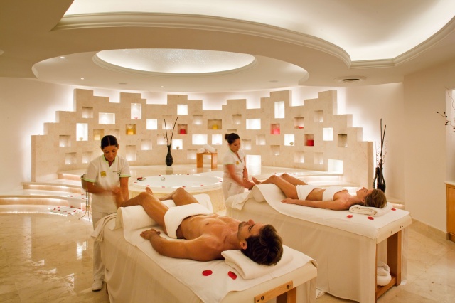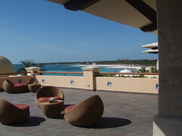 My junior suite and balcony gazed over the oversized pool with palapa (thatched-roof) bar, children’s water park, and immense beachfront. Inside, the gold and orange motif was attractively balanced by dark tropical wood cabinetry with neat touches like a rain dance-style shower, handmade Mexican porcelain tile floors, and 400-thread-count Egyptian cotton sheets. A nightly turndown service was complemented by a daily fruit basket with bottle of wine and free but limited mini-bar.