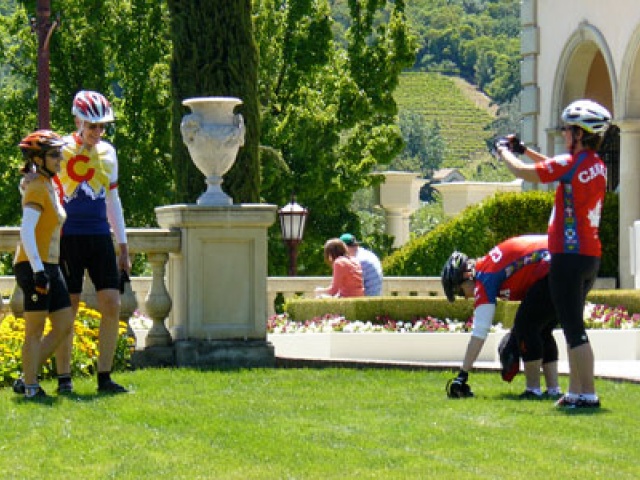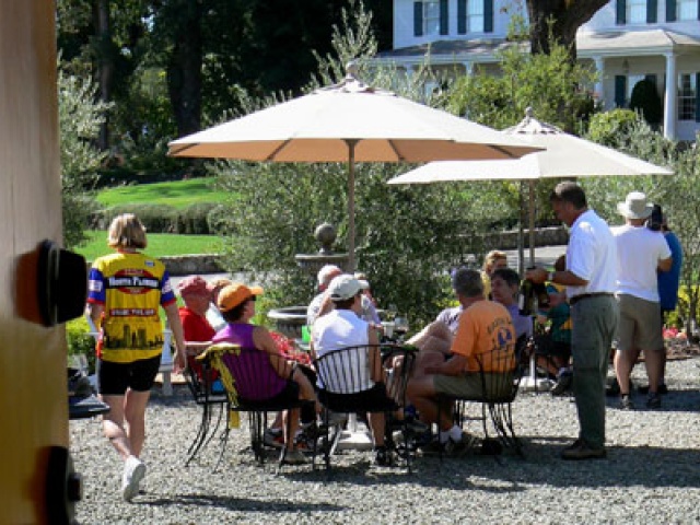 The last hill of the day was biking up to the private entrance of the Madrona Manor. The grounds and this majestic estate (built in1879) were a time travel back to an era of Victorian elegance. The fountain, tiered gardens and sprawling front porch were a welcoming sights after a full day of cycling. It was comforting to know that the Manor would be our "home" for the next two nights and I looked forward to a soak in my tub before dressing for dinner. My comfy room was filled with antique furniture, wood burning fireplace and a gorgeous glass headboard that lit up like a Tiffany lamp. Two freshly baked chocolate chip cookies had been placed on my dressing table. Now that's what I call "turn down" service! Later, seated in the restaurant's private parlor, we were treated to a gourmet dinner of Yukon gold potato gnocchi followed by local duck breast served with apples and a sinful chocolate mousse bar accompanied with blueberry sorbet. Each course was perfectly paired with wine and dessert was served with a Dow's 20 year Tawny Port. Chef Jesse Mallgren and his team deserved a standing ovation for these culinary creations. Our meal, along with the wines and great conversation, was nothing short of spectacular.