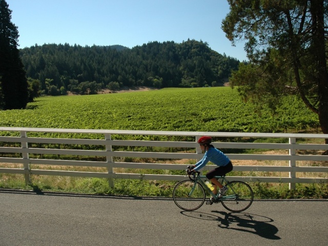 After a blissful night's sleep, I woke at dawn and tiptoed to my balcony. The fog had not yet lifted from the vineyards below and the view was absolutely magical. I sat on my chaise lounge and took deep, meditative breaths and lingered there, transfixed. After dressing in layers of riding gear, I headed downstairs to the breakfast buffet. I helped myself to fresh fruit, a giant homemade popover and a slice of skillet frittata. I savored this bountiful breakfast guilt free knowing that I would burn all these calories on my ride today. Biking out of Healdsburg and into the Alexander Valley was exhilarating. Short climbs were well rewarded with the visual expanse of open fields, wooded hillsides and opulent vineyards. There are 160 wineries clustered here within a thirty-mile radius and it's no wonder that they call these valleys "heaven condensed." I certainly felt as though I was in heaven--it was oh so peaceful. I felt totally at one with my surroundings. Embracing the rhythm of my breathing as I pedaled was truly meditative; my senses were awakened in ways I could've never imagined.