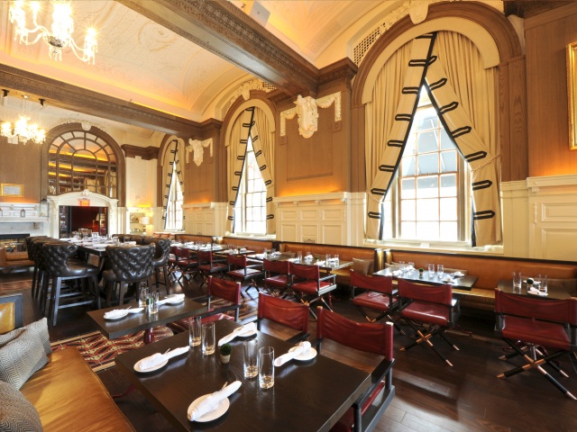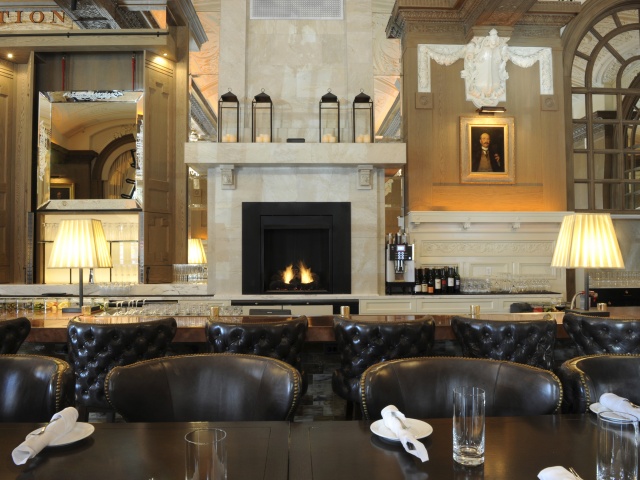 You feel the grandeur as soon as you walk in to the new entrance on St. James Avenue. A soaring neoclassical space, the design is a marriage of past and present; vaulted ceilings and original baroque plaster contrast with a fashionable contemporary feel. Luxurious tufted leather bar stools flank the long snaking 83 foot copper topped bar. Massive stone fireplaces, and a state-of-the-art wine room add to the timeless ambience.