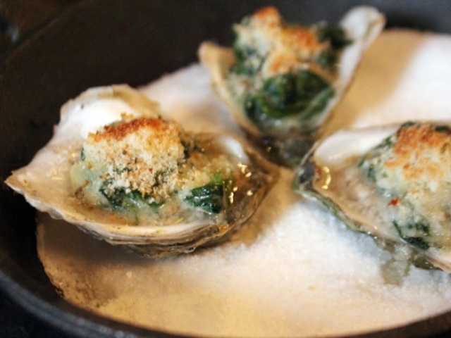 Since I needed to be on my game for the feast we were about to encounter, I decided that sipping wine would be a safer option. The wine list is a carefully chosen selection of respectable labels in many price ranges. It was nice to see many wines available by the glass (14 reds alone), as well as a great selection of half bottles. We ordered a half bottle of the 2009 Christian Moreau “Vaillons” Chablis, $42, to accompany the selection of appetizers our very friendly and knowledgeable waiter helped us choose. The menu emphasizes many seafood dishes, as well as vegetarian options. Out came our first dish, Hearth Baked Powder Point Oysters Rockafeller $15. Three plump, sweet oysters topped with garlicky sautéed spinach and a light Pernod cream were rich and flavorful yet not heavy. They were presented in a small cast iron skillet resting on a beautiful slate board. This presentation is used for several offerings that will arrive at your table straight from the oven. Waiters get quite a workout lifting these platters to and from tables all night! The Sea Scallop Crudo, $16, was one of my favorites. Glistening and super fresh, they were served sliced sashimi style over baby arugula. Their delicate sweet flavor was enhanced by a slightly sweet, tart passionfruit sauce and the crunch of it’s seeds gave the dish interesting texture. ....