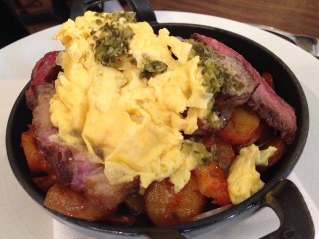 The pan seared steak and eggs that rested on roasted potatoes in a chimichurri sauce $28 were only enhanced by the small crockpot they arrived in.